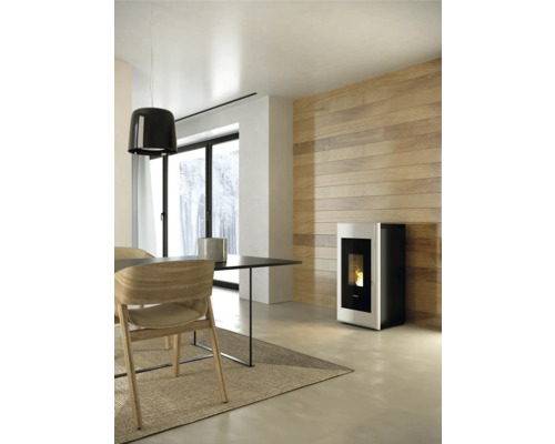 Características de la estufa de pellets hermética FreePoint One de acero blanco de 7 kW.